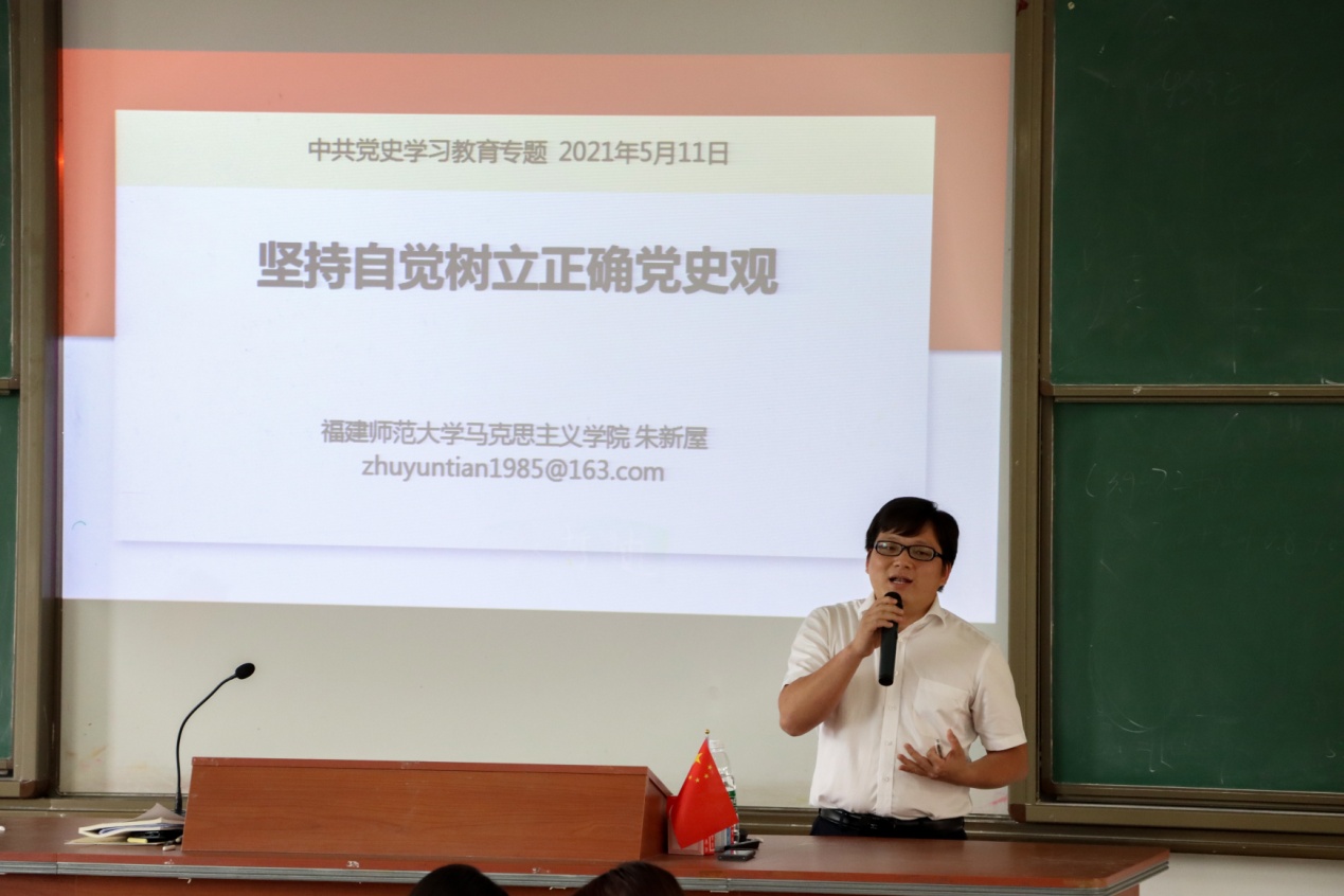 5月11日下午,马克思主义理论大讲堂邀请党史学习教育省委宣讲团成员朱新屋老师到我校作题为“坚持自觉树立正确党史观”的专题讲座。beat365亚洲版官网全体教师、大讲堂成员,统战部、规划处、国资处支部党员到场听取报告。