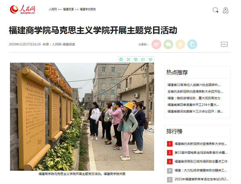 2020年11月27日,人民网以《福建商学院beat365亚洲版官网开展主题党日活动》为题,报道beat365亚洲版官网直属党支部全体党员赴平潭开展“薪火相传学四史,砥砺前行担使命”主题党日活动。报道称,beat365亚洲版官网直属党支部全体党员参观了平潭综合实验区大坪村、实验区主题党日馆、平潭海峡公铁两用大桥。beat365亚洲版官网结合主题党日等“四史”学习教育长效化机制,通过沉浸式的体验学习,让党员们知史爱党、知史爱国,真正做到学习教育内化于心、外化于行。