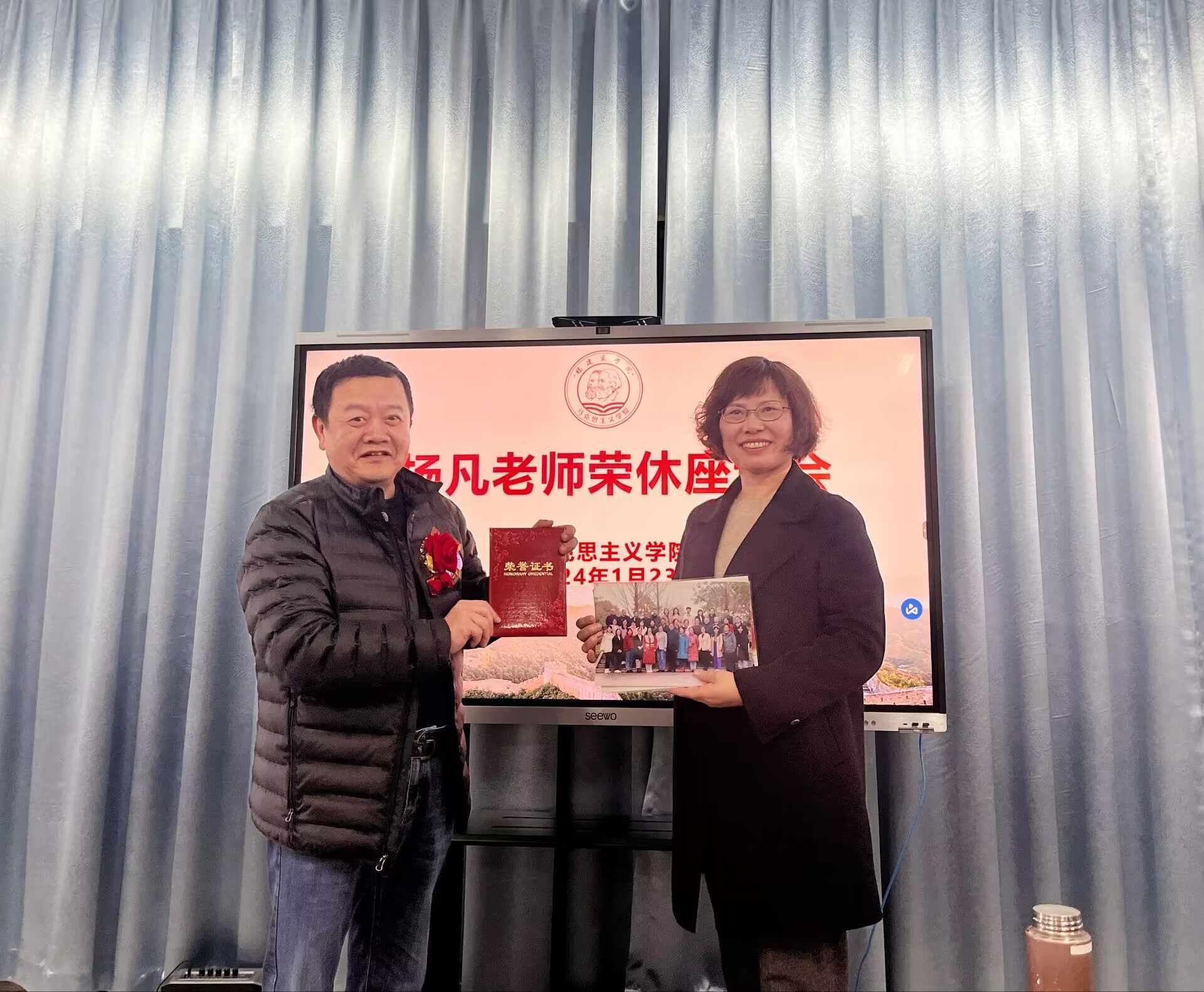 随后,beat365为杨凡老师光荣退休举行隆重的欢送会。杨凡老师系beat365思想道德与法治教研室教师,从教38年,退休在即。欢送会上,林萍院长为杨凡老师颁发了“光荣退休”纪念证书,并对杨凡老师为马院作出的贡献表示最诚挚的谢意。思想道德与法治教研室为杨凡老师献上鲜花及礼物,并表达了对杨凡老师的留念之情。接着,杨凡老师发表了深情的感言,感谢学校领导、单位同事的关心和厚爱,感恩在学院的每一天。最后,马院老师们纷纷表示:希望杨凡老师多与学院同仁联系,常回家看看,与学院共谋发展、与同仁共叙旧情。