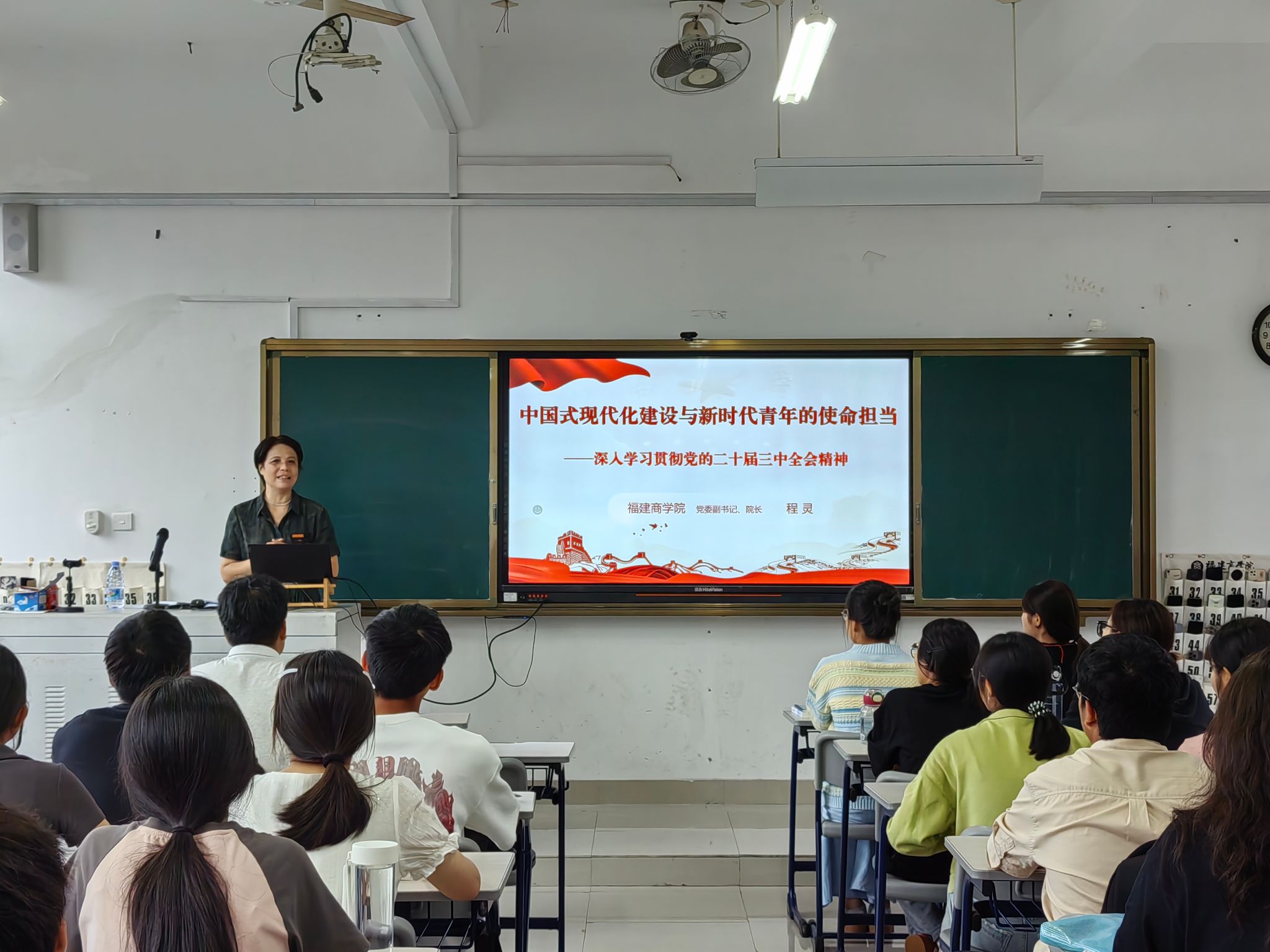 程灵从“深刻领会党的二十届三中全会主题”“深刻领会进一步全面深化改革的重要性和必要性”“深刻领会进一步全面深化改革的总目标”“深刻领会进一步全面深化改革的重大原则”“深刻领会进一步全面深化改革的重大举措”五个方面,深入阐释了党的二十届三中全会精神的丰富内涵。程灵围绕“以中国式现代化全面推进强国建设、民族复兴伟业进程中新时代青年的使命担当”这一主题,结合大学学习生活和青年心理特点,以生动翔实的典型案例,勉励引导同学们要立志高远,筑牢理想信念“压舱石”;勤学苦练,磨砺过硬本领“金刚石”;精进笃行,擦亮艰苦奋斗“磨刀石”;坚定“请党放心、强国有我”的青春誓言,奋力谱写福商学子的青春华章。