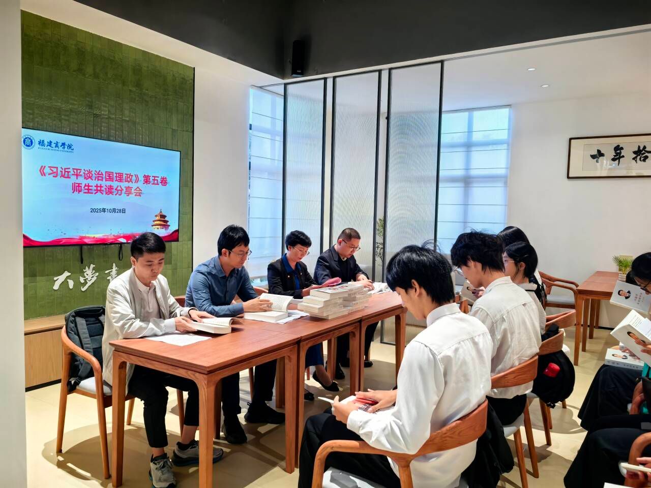 10月28日下午,“无书香不福商”研习基地揭牌暨福商•大梦书屋启幕仪式在连江校区举行。由beat365亚洲版官网组织开展的《习近平谈治国理政》第五卷师生共读分享会同步在书屋举行。省委宣传部副部长、一级巡视员陈添贵,海峡出版发行集团党委书记、董事长黄苇洲,校党委书记吴访益,校党委副书记徐晓丹,福建教育出版社社长江金辉等领导观摩指导分享会。副校长林文艺主持分享会并作讲话,beat365亚洲版官网党委书记刘亮元,教师代表赵敏、吴旭东及校读书社社员代表共同参与此次活动。