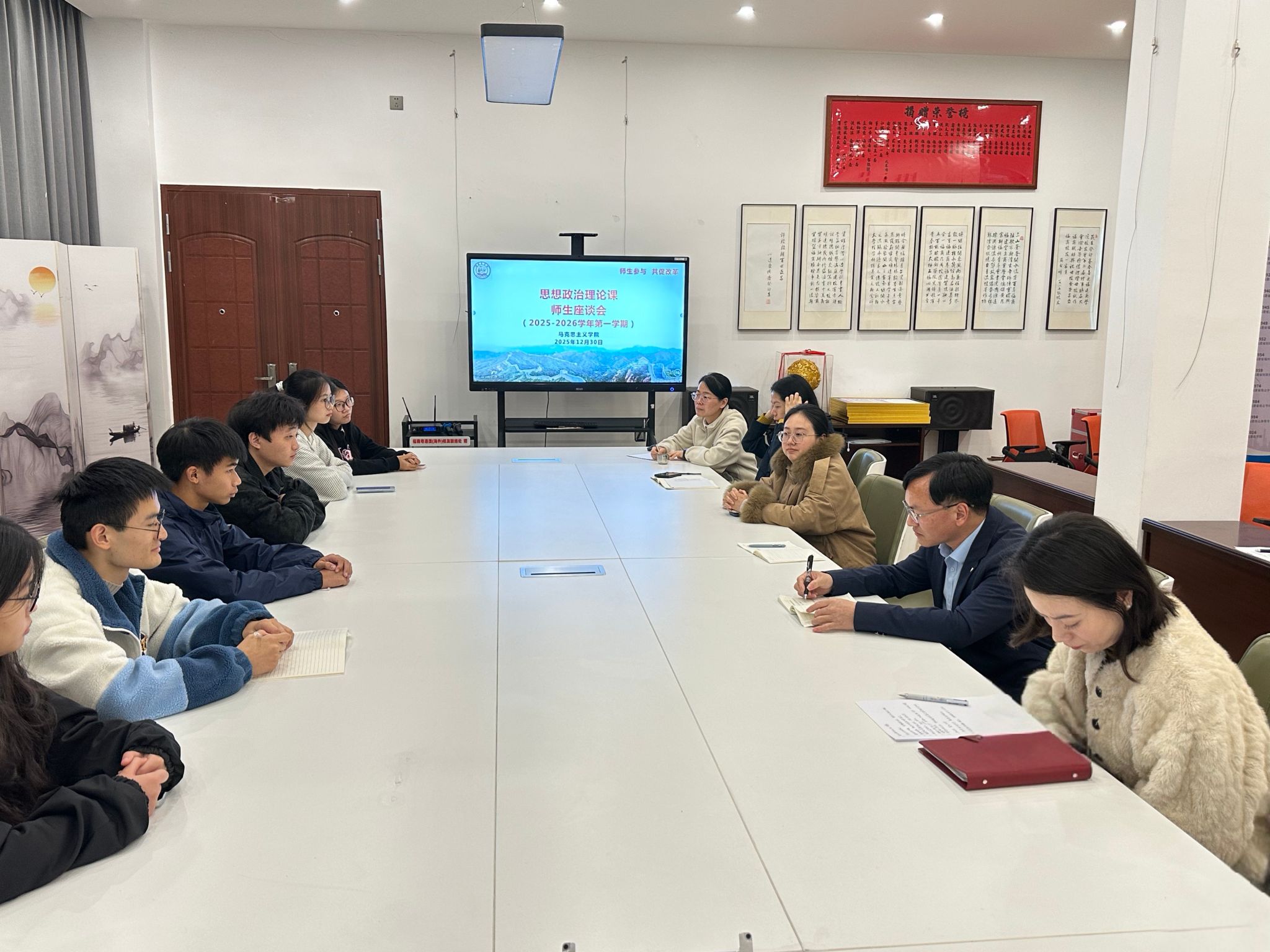 2025年12月30日,beat365亚洲版官网在鼓楼校区召开2025-2026学年第一学期思政课师生座谈会。教务处、质评处、beat365亚洲版官网有关人员,校院教学督导,beat365亚洲版官网各教研室主任参加座谈会听取学生代表意见建议。