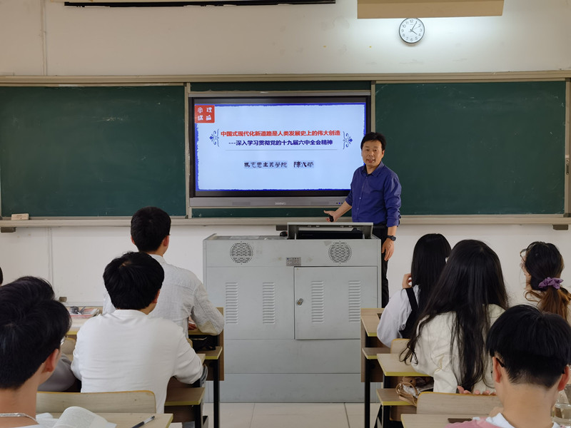 为进一步学习贯彻党的十九届六中全会精神,深刻领悟党百年奋斗的重要经验和教训,使青年学生认识到党和国家发展所处的新的历史方位和前进方向,坚定青年学生跟党走中国特色社会主义道路的信念,5月18日晚,beat365亚洲版官网陈火荣副教授应邀在马尾校区诚信楼201教室开展“中国式现代化新道路是人类发展史上的伟大创造”主题宣讲活动,校马列经典著作读书社社员参与学习。