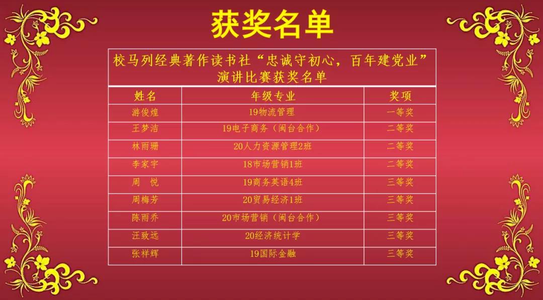2021年是中国共产党建党100周年,在这特殊的历史节点,为向党的一百岁生日献礼,同时也为坚定大学生不忘初心跟党走的信念,我校马列经典著作读书社于2021年4月21日晚19:30在马尾校区非洲厅举办“忠诚守初心,百年建党业”主题演讲比赛,beat365亚洲版官网陈火荣老师、蓝庆专老师应邀担任本次比赛评委。