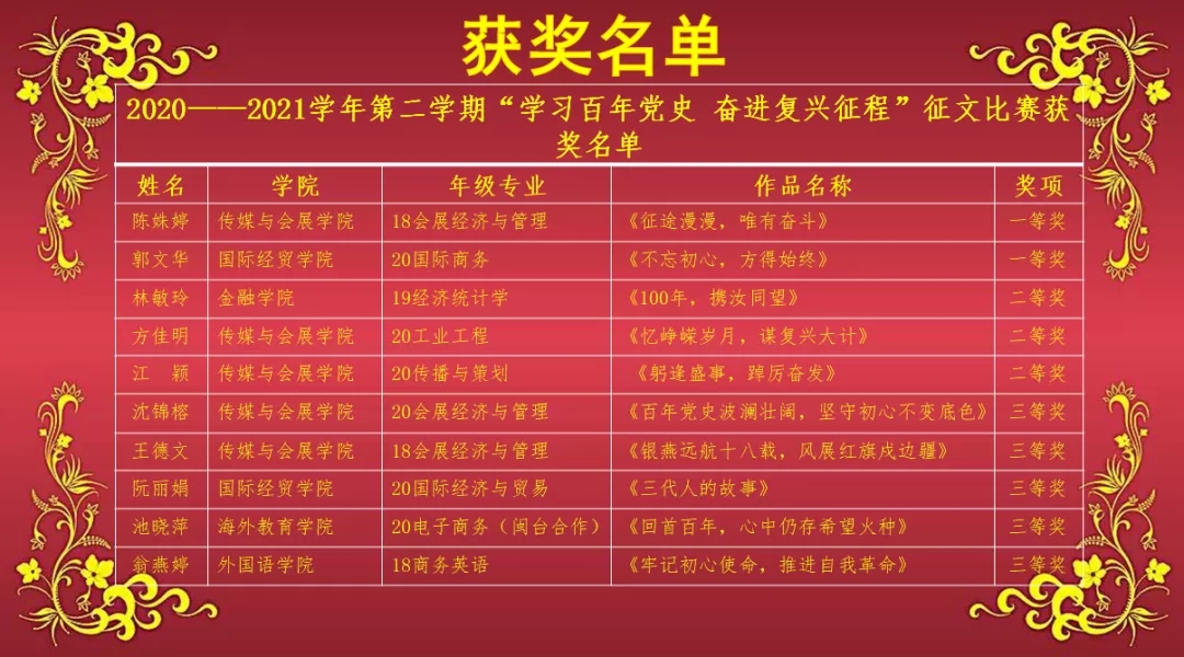 为进一步学习贯彻习近平新时代中国特色社会主义思想,回顾中国共产党诞生以来领导人民不断奋进的光辉历程和取得的伟大成就,传承红色基因,牢记初心使命。校习近平新时代中国特色社会主义思想读书社面向全校社员开展主题为“学习百年党史 奋进复兴征程”主题征文活动。