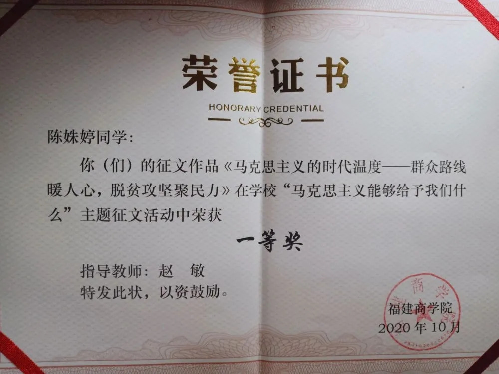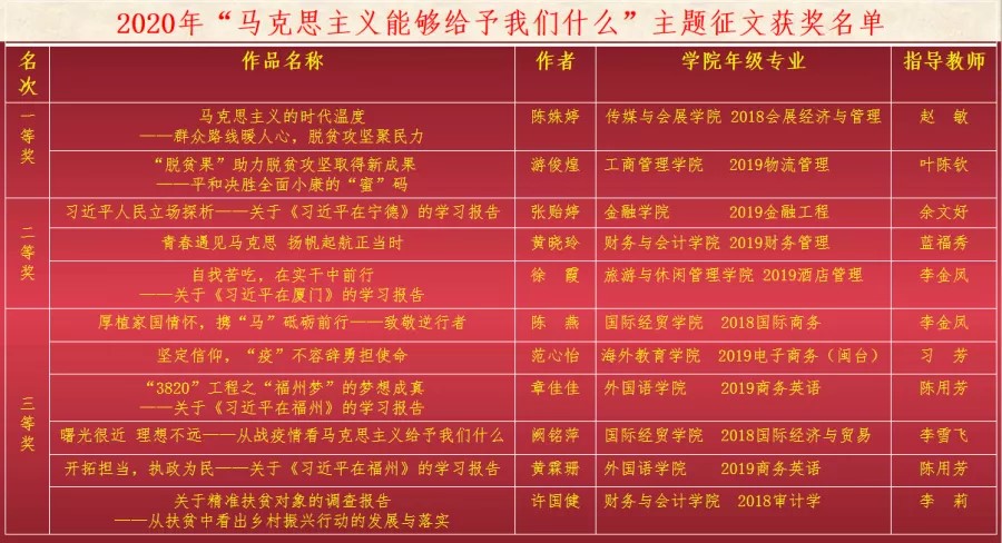 活动自2020年6月开展以来,各学院积极组织学生撰写,至截稿日期,共收到参赛征文80余篇,学生工作部、beat365亚洲版官网等部门组织开展初选、复选,推出11篇参加决赛,经校外专家评审,最终评出一等奖2名,二等奖3名,三等奖6名。其中,推荐前五名参加“马克思主义能够给予我们什么”—第四届福建省高校大学生主题征文和微演讲活动。具体获奖名单如下: